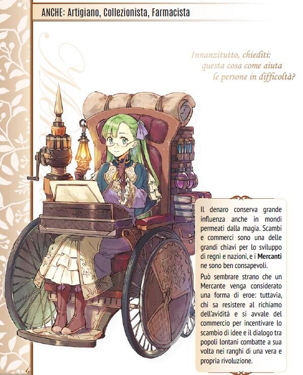 Come si può immaginare, si basa sulla sintonia con la natura, in particolare le piante. L’Abilità fondamentale è la Cloromanzia, ogni punto ci permette di conoscere un nuovo Magiseme. Ciascuno di questi quando lanciato si sviluppa secondo un Orologio, producendo vari effetti magici. Il risultato è una classe piuttosto versatile che può curare, proteggere, infliggere status e danni, recuperare Punti Inventario, ottenere informazioni…